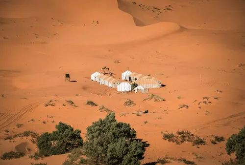 Morning stroll in the Tinghir palm grove and the Todra Gorges. A 4x4 journey into the desert, through the stunning landscapes of the Ziz and Tafilalet valleys. Lunch in Erfoud, the fossil capital. A 4x4 drive across the hamada desert to the Merzouga dunes. A camel trek for an unforgettable sunset ride on the giant dunes of Erg Chebbi. A magical evening in a luxury bivouac. Dinner and overnight stay in the heart of the Sahara.